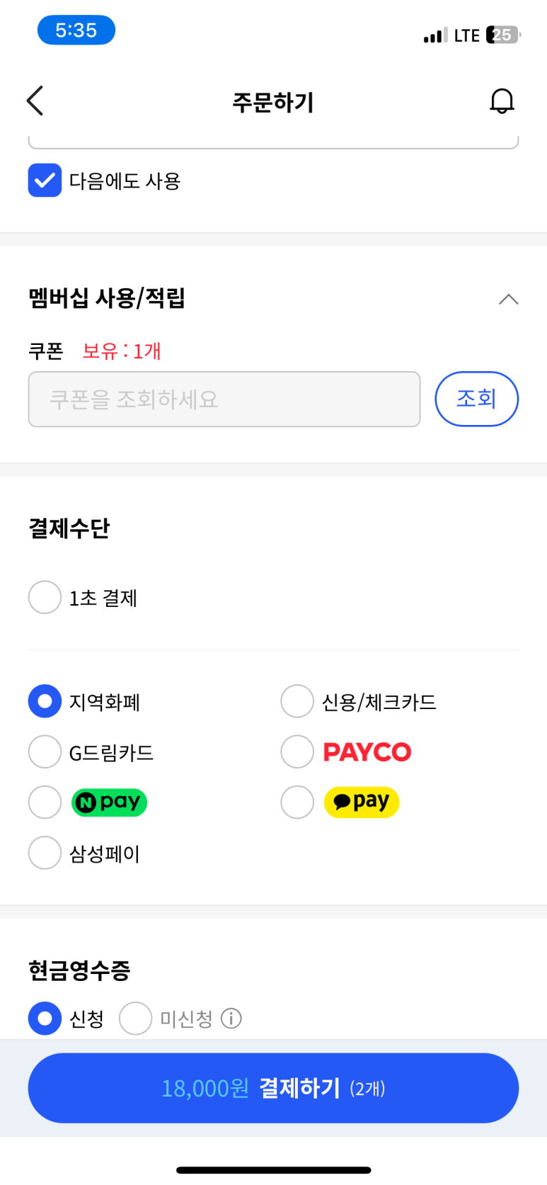 사용가능하면 아래와 같이 지역화폐 선택이 가능하게