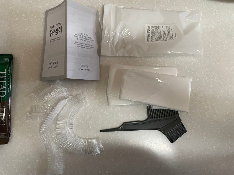 머리 덮개, 귀 덮개, 빗, 비닐옷, 매뉴얼이 들어 있다.